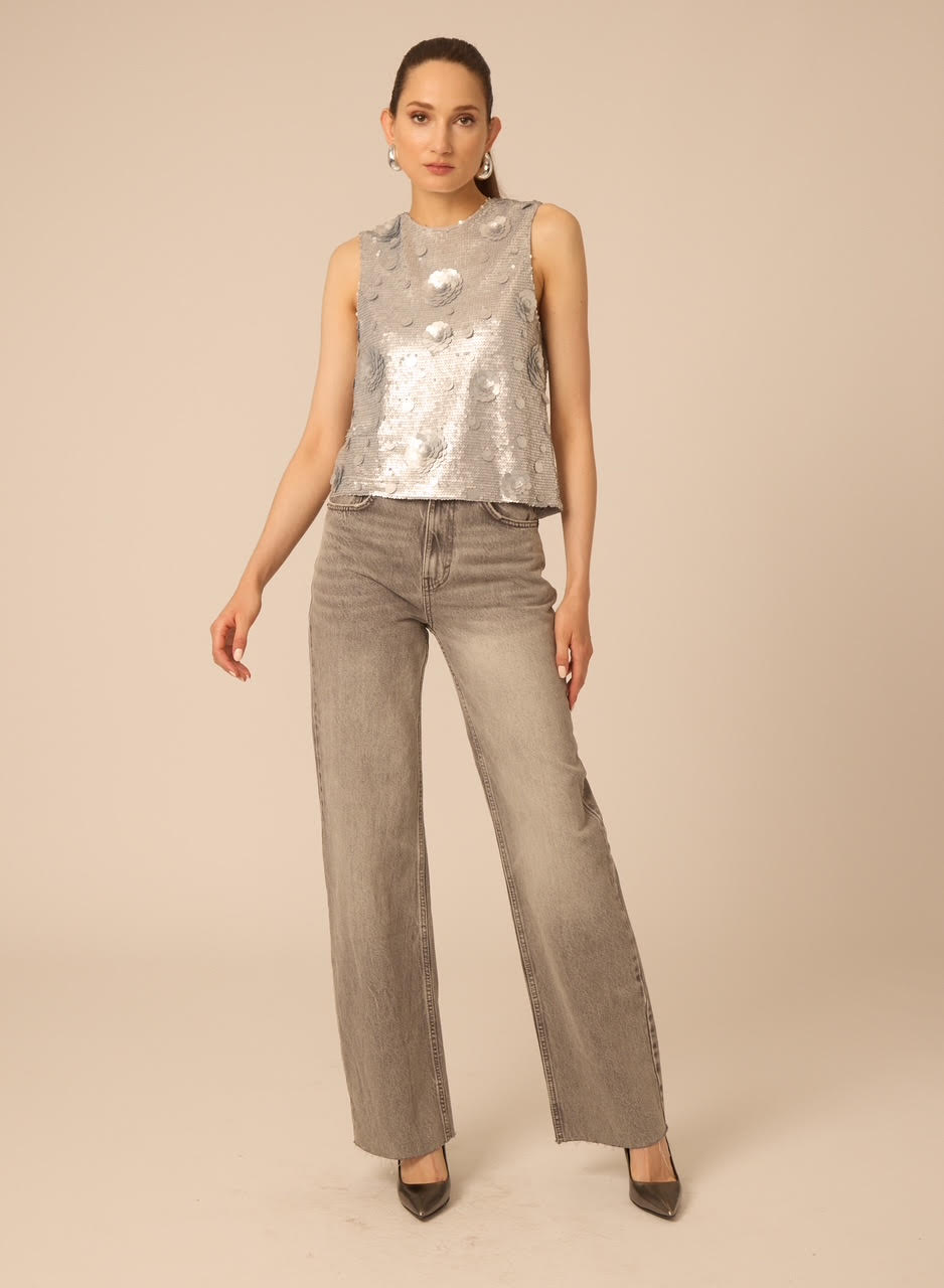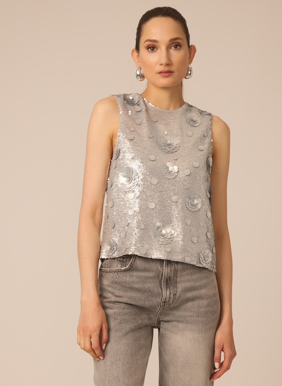 -This sleeveless silver top is fully adorned with layered paillette sequins arranged in soft floral motifs.