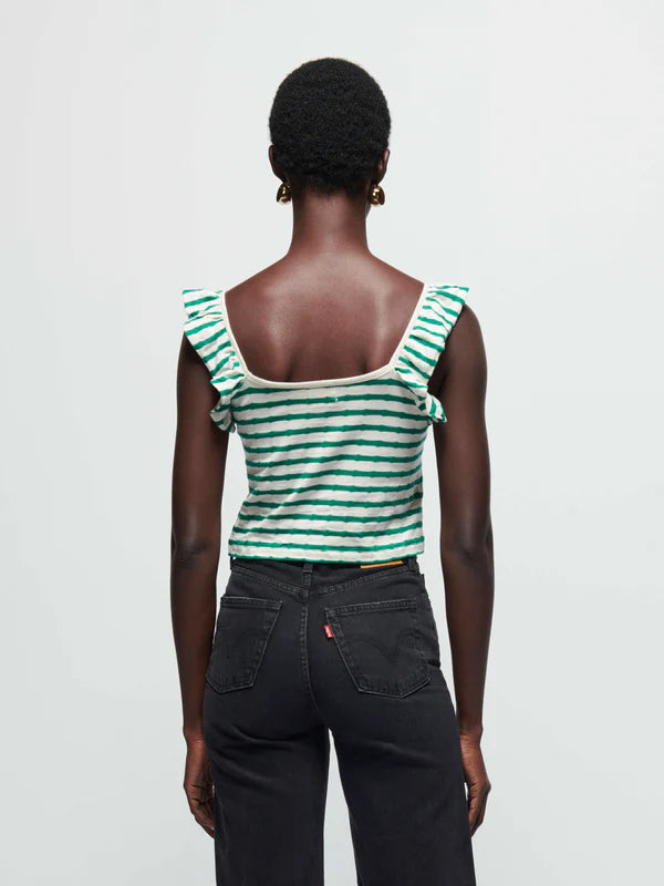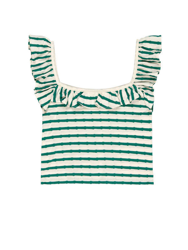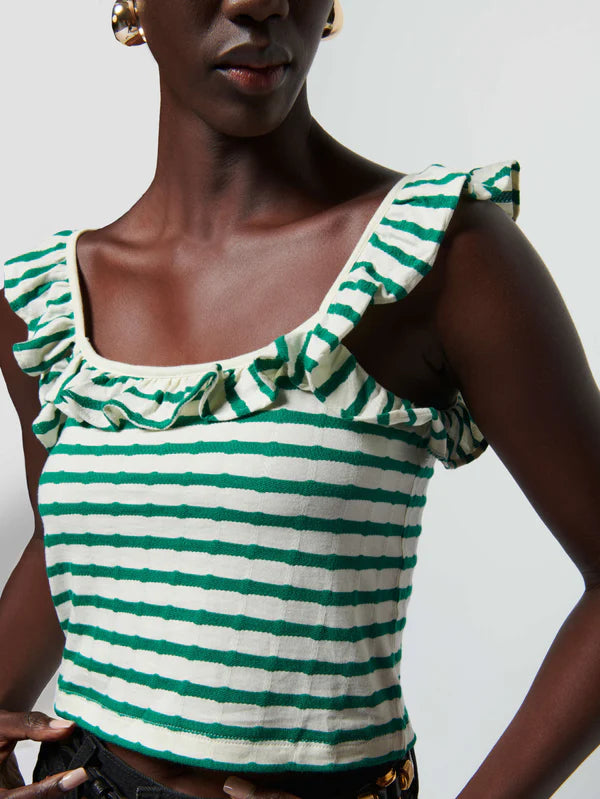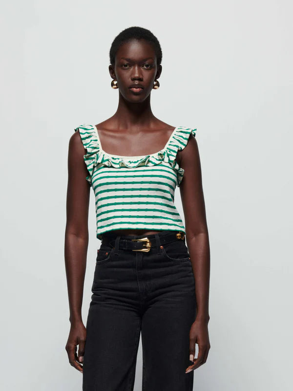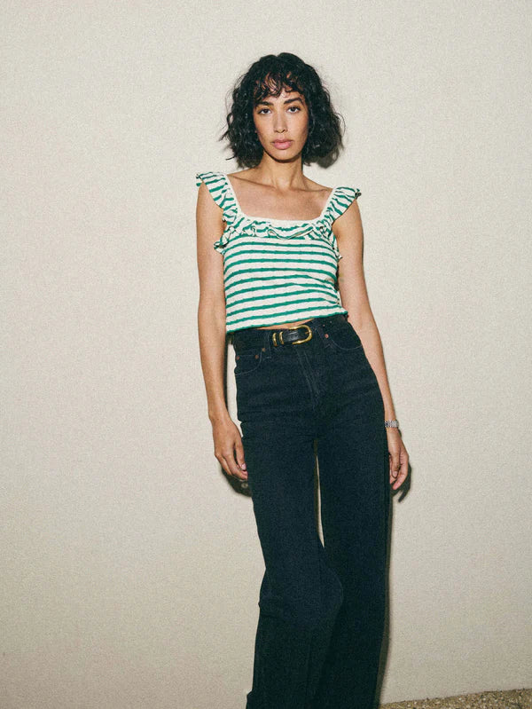 We added a ruffle trim around the straps and square neckline of your new go-to tank, for an effortlessly girly touch. You’re welcome. (This one comes in Verdant Green Stripe.)