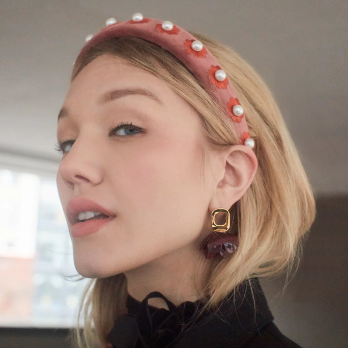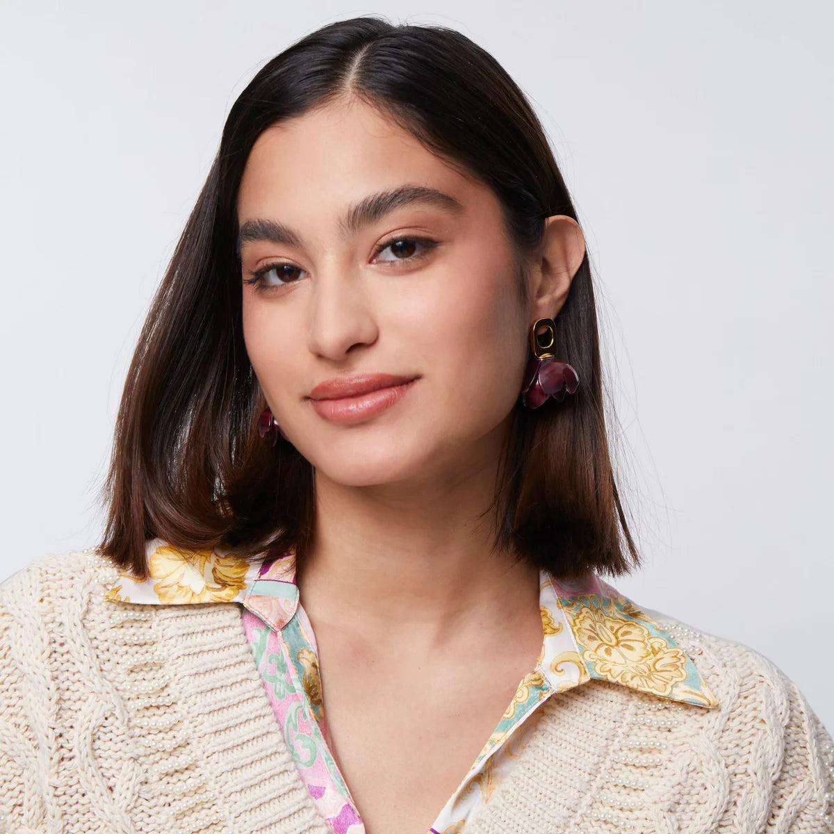 Our floral button earrings. Lightweight and perfect to wear from day to night. Featuring golden charms, hand set colored crystals & trinkets from our found treasures inspired Fall collection.