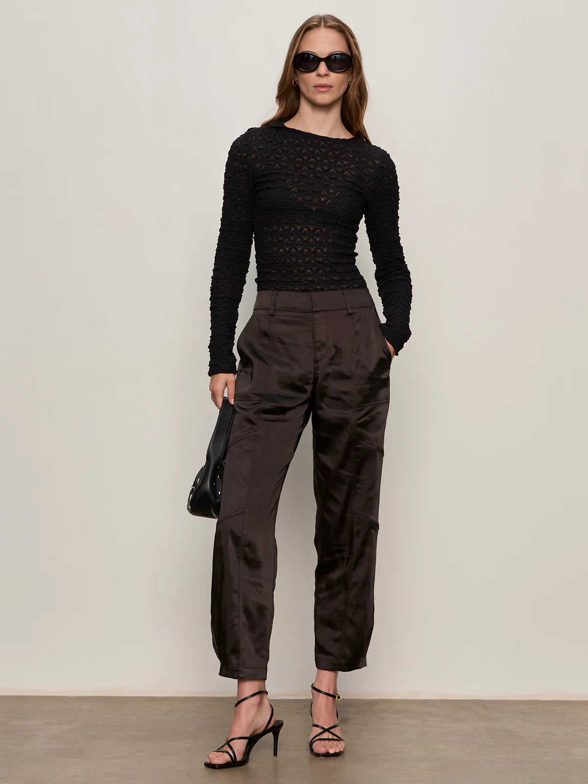 These pocket-packed utility pants cut in a seamed, tapered-leg silhouette that ends at the ankle get an after-hours update in lustrous satin.