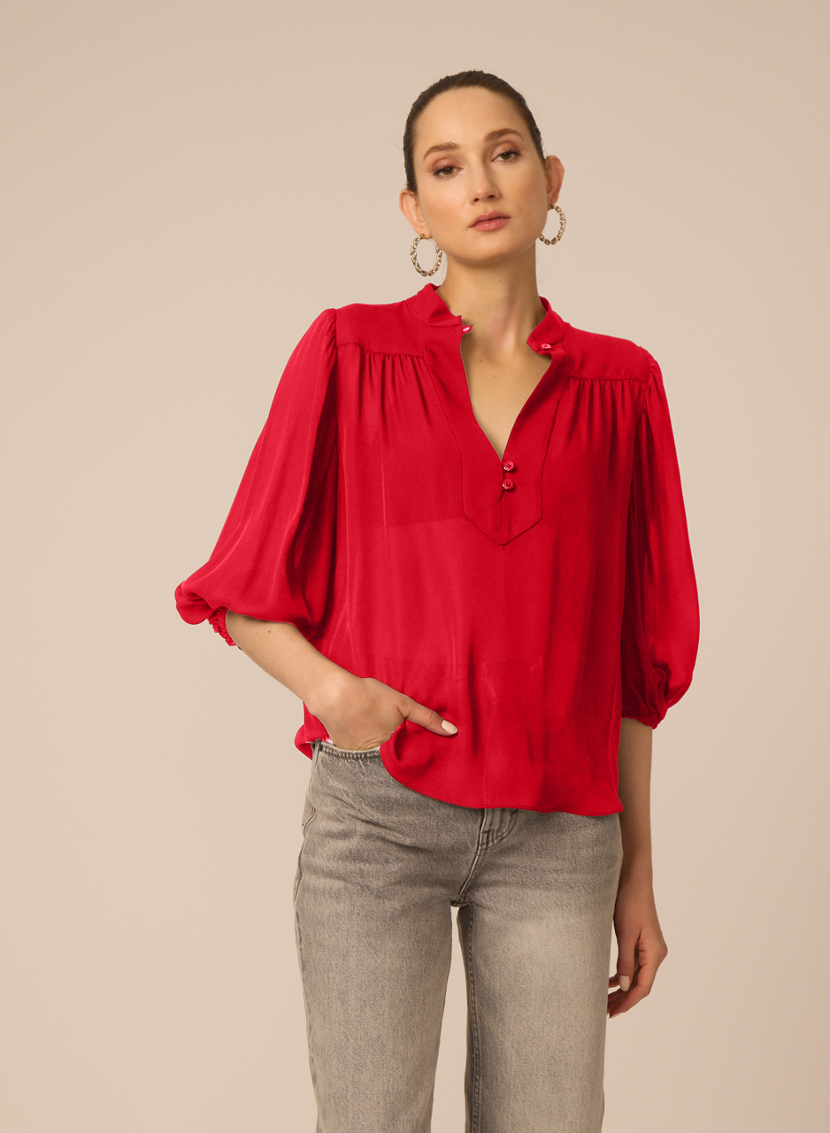 -A Gilner Farrar essential. This best-selling blouse is in silk georgette. Has a delicate gathering at the shoulders and voluminous three-quarter sleeves.