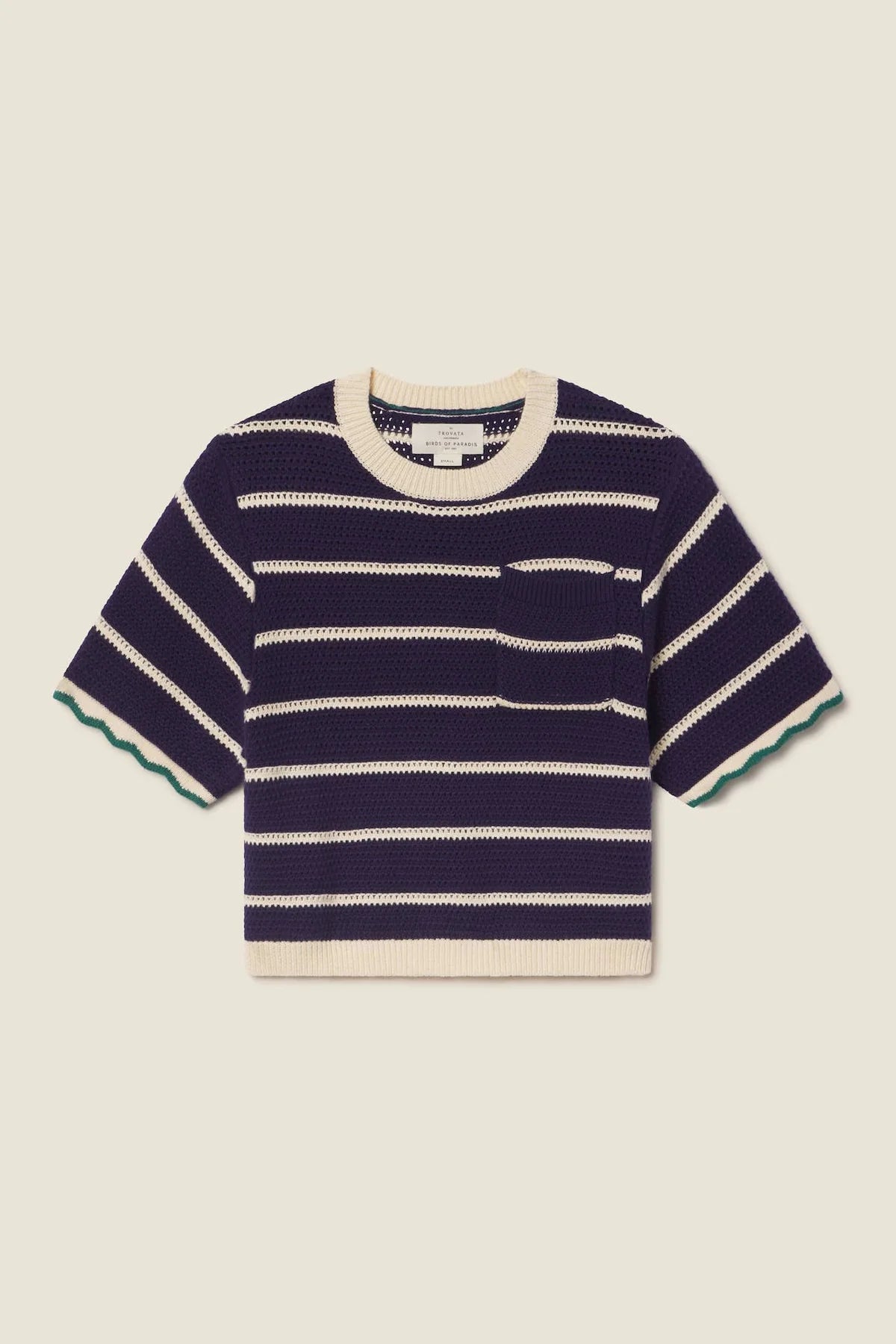 Our Jules sweater has a loose knit weave perfect for Spring days. Shown here in our Navy/Antique White Stripe. Made from our soft cotton.