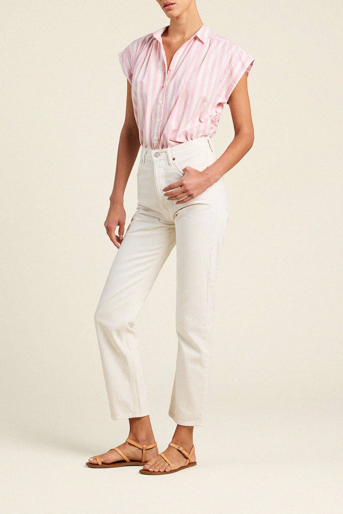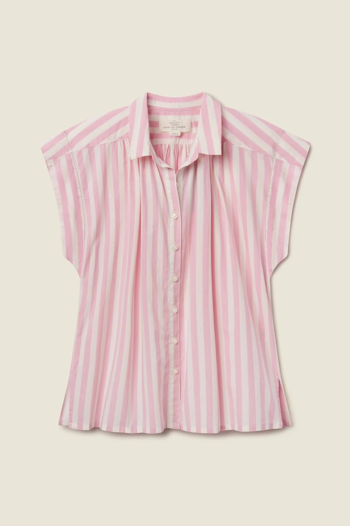The Della Shirt is a new and refined take on our classic Marianne "B" Blouse. Easy gathers at the front and back body highlight the feminine twist of this shirt. The slightly cropped body has short side slits and is completed with out signature antique white buttons. Shown here in Pink Stripe and made from our cotton poplin.