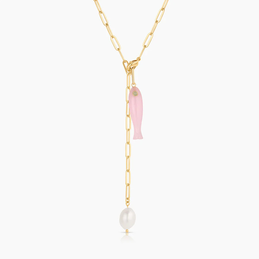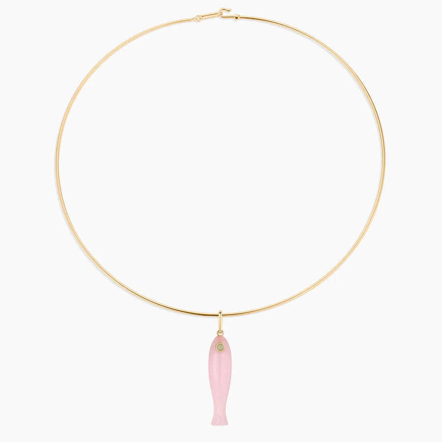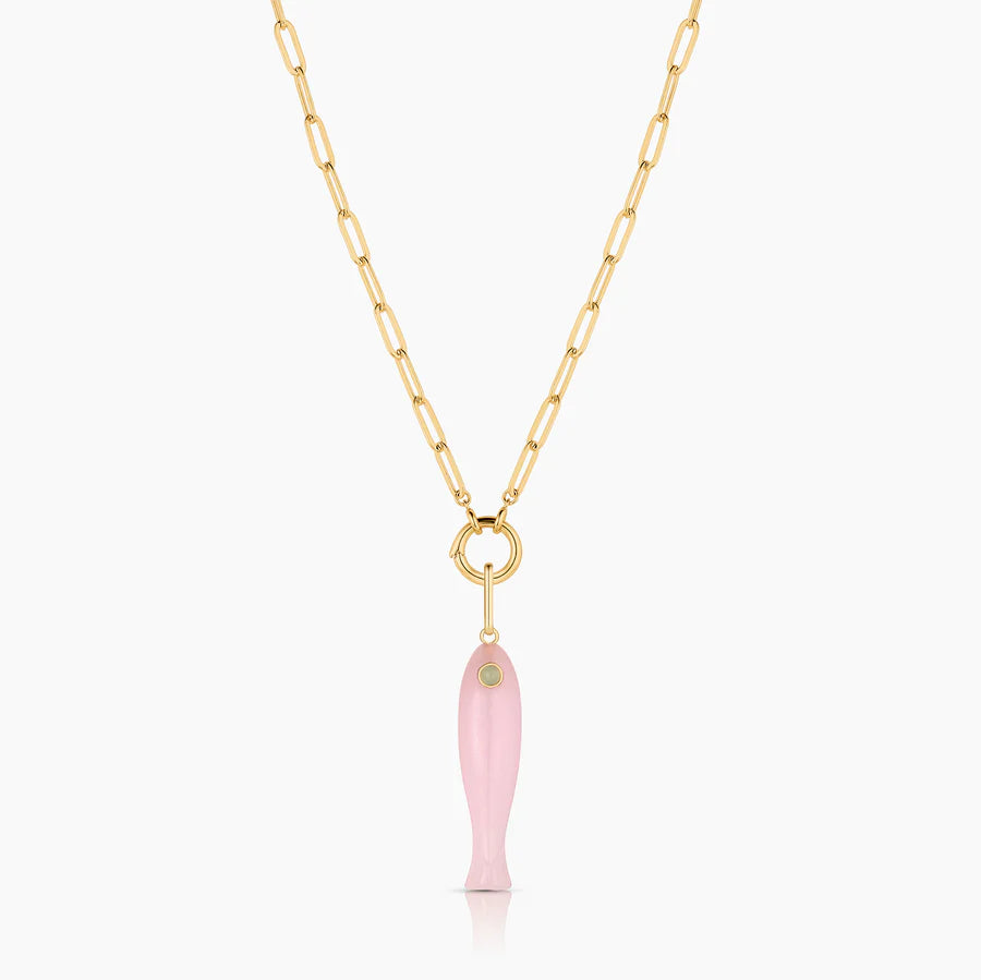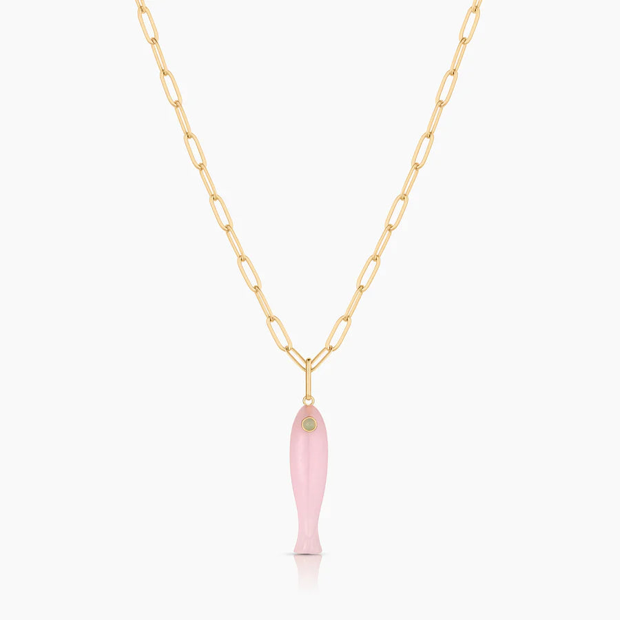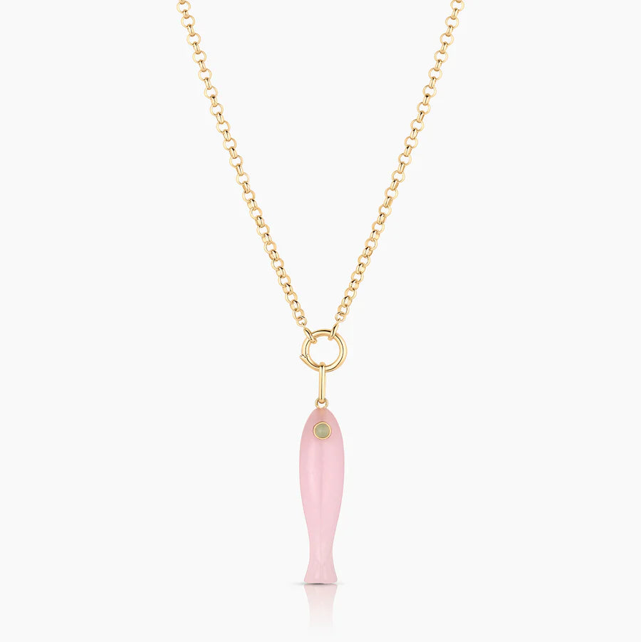 She's a best seller for a reason. Our new favorite hand-carved gemstone fish charm has quickly become the must-have charm of the season. This pink jade fish (with a chrysoprase eye!) can be worn alone on our Monet Choker or necklace chains, or layered with your other favorite charms. Our Fortuna isn't just a cute charm, it's a little amulet for good fortune and luck.