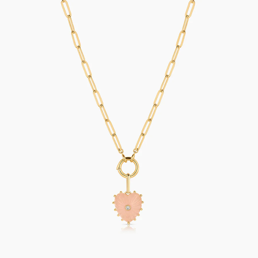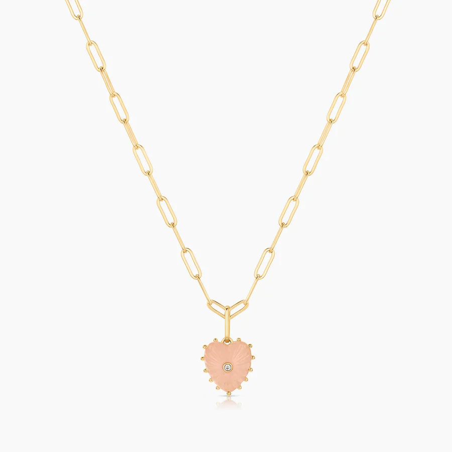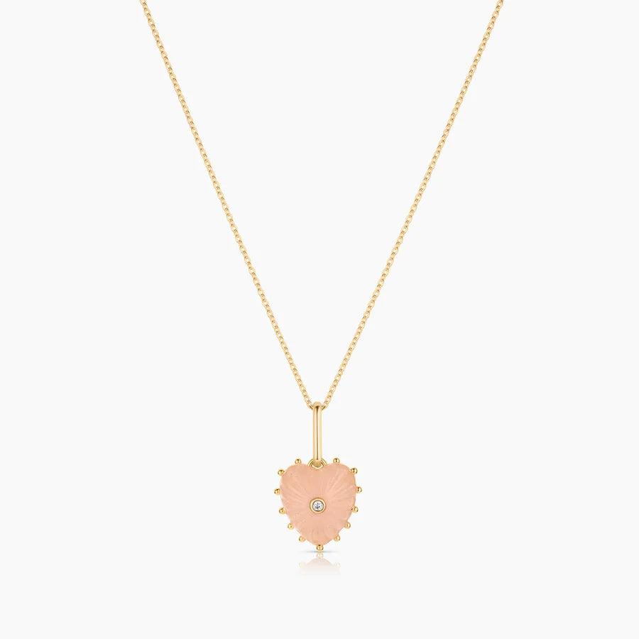 She's Malene's baby sister, a smaller hand-carved pink jade heart charm with a sparkling center stone. A favorite for gifting and layering.