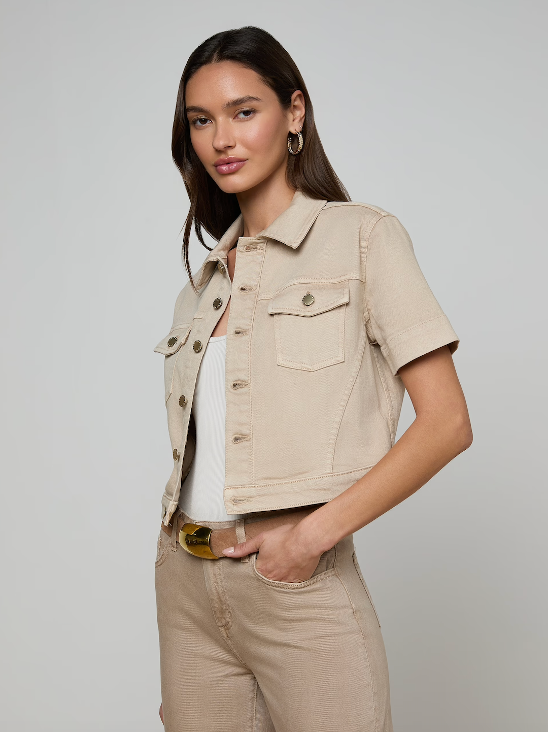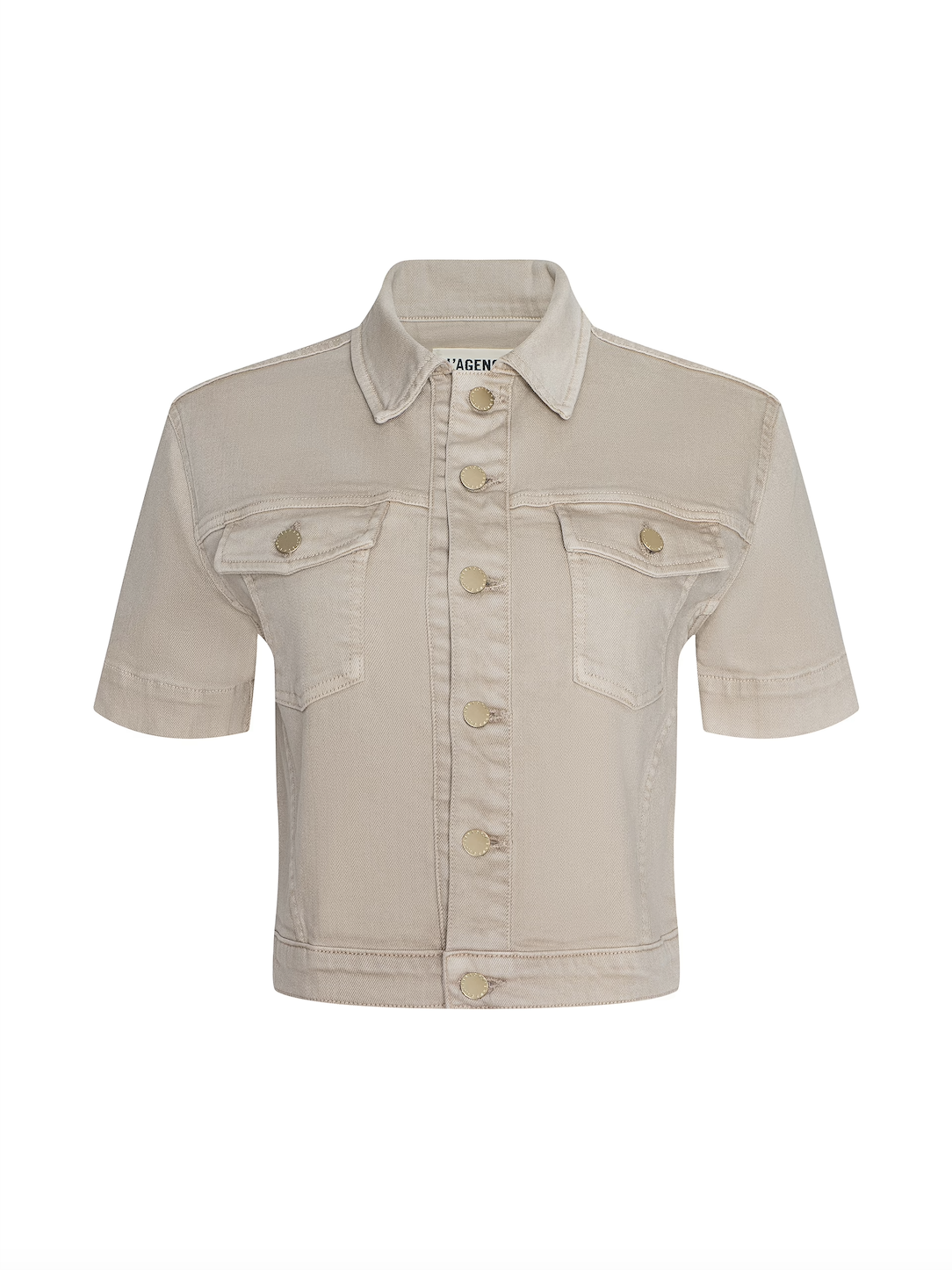 A new take on the jean shirt jacket, in neutral tan denim. The Kirstie delivers a cropped, short-sleeve silhouette. Classic utility details—chest pockets, a pointed collar, and logo-embossed buttons—ground the look, while the clean proportions make it an easy layer for warm-weather dressing.