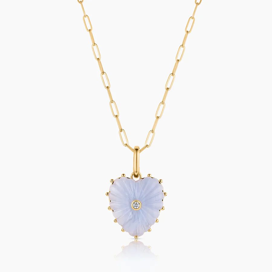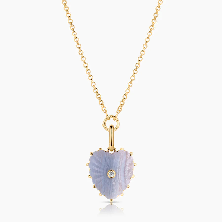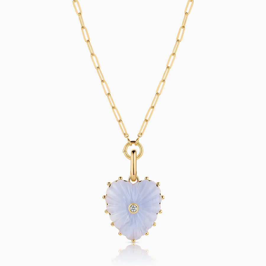 Our Malene heart charm in dreamy blue lace agate—hand-carved stone, cubic zirconia, and high-shine gold on a hinge clip for removability. Everything you want and need to make a statement.