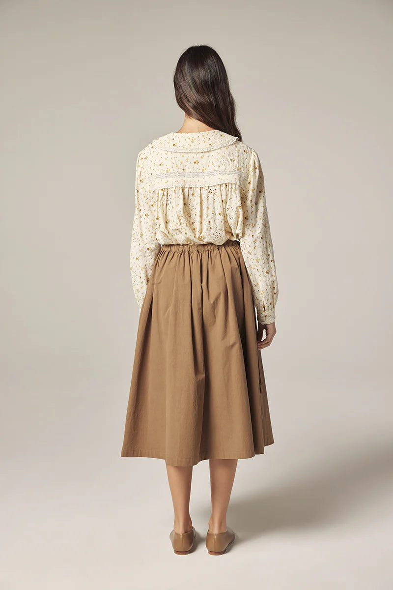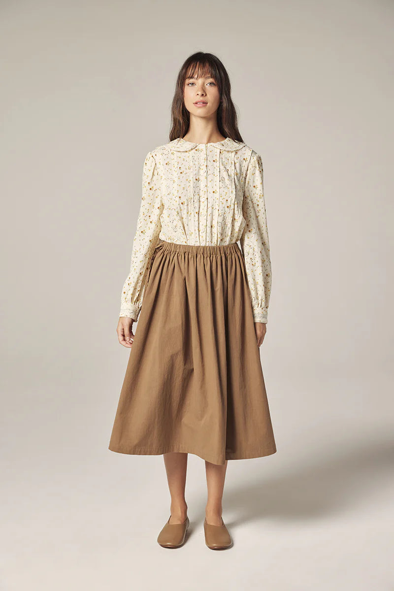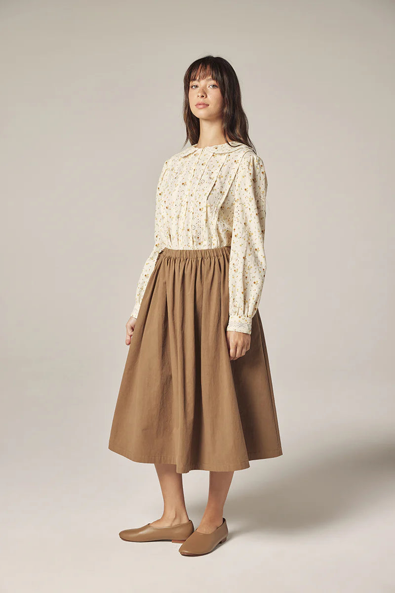 Thoughtfully detailed with tonal buttons and gentle pintucks at the front, the silhouette falls with easy grace — both tucked and untucked. Eyelet embroidery and lace insets across the bodice and back yoke offer a vintage-inspired charm without excess, making this shirt both poetic and poised.