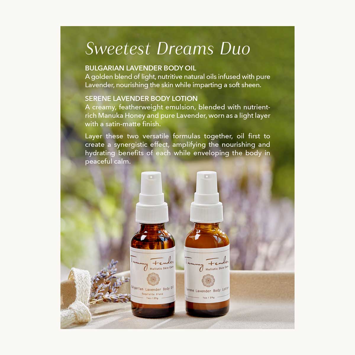 A duo with very soothing intentions. Blended with pure essence of Lavender, nature’s supremely calming remedy, both Bulgarian Lavender Body Oil and Serene Lavender Body Lotion create an aromatic cocoon of effortlessness while nurturing the skin. Reach for body oil, a golden blend of light, nutritive natural oils, to impart a soft sheen. Choose body lotion, a creamy, featherweight emulsion, blended with nutrient-rich Manuka Honey, to create a satin-matte finish. Or layer these two versatile formulas together—oil under lotion—to create a synergistic effect, amplifying nourishing and hydrating benefits.