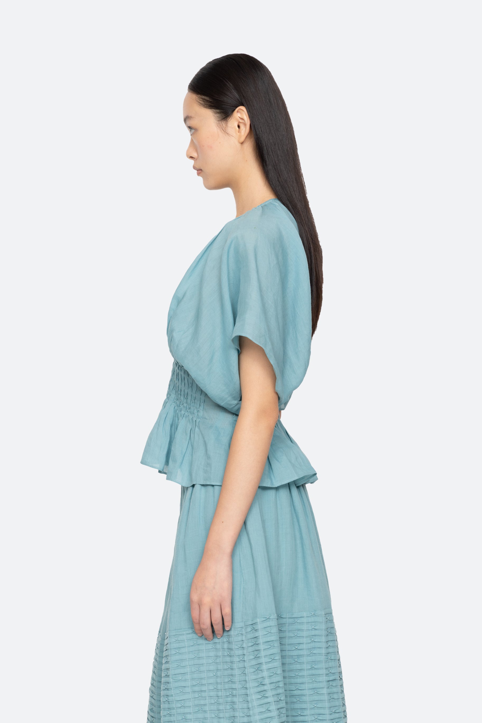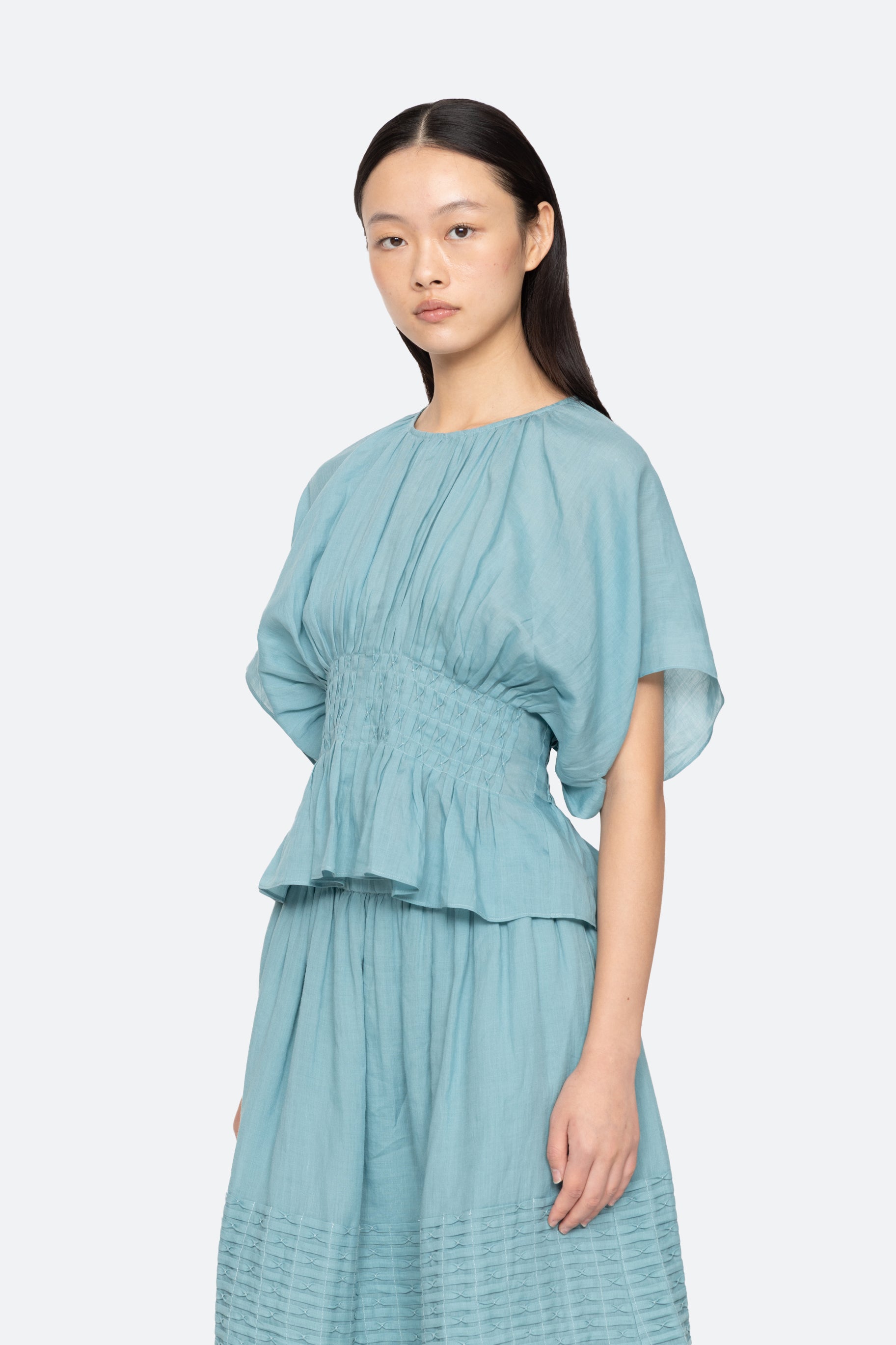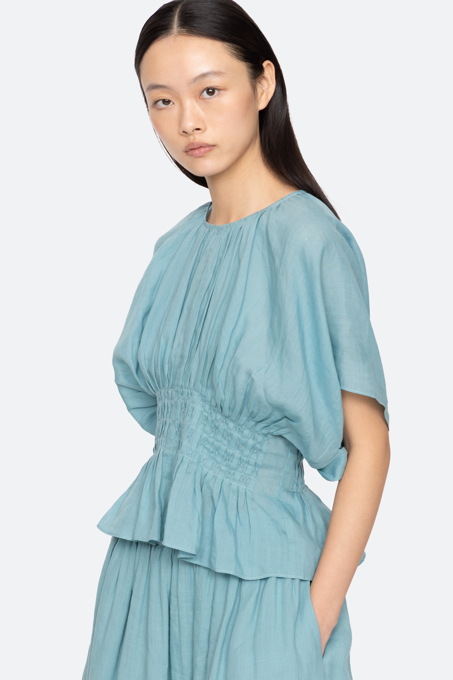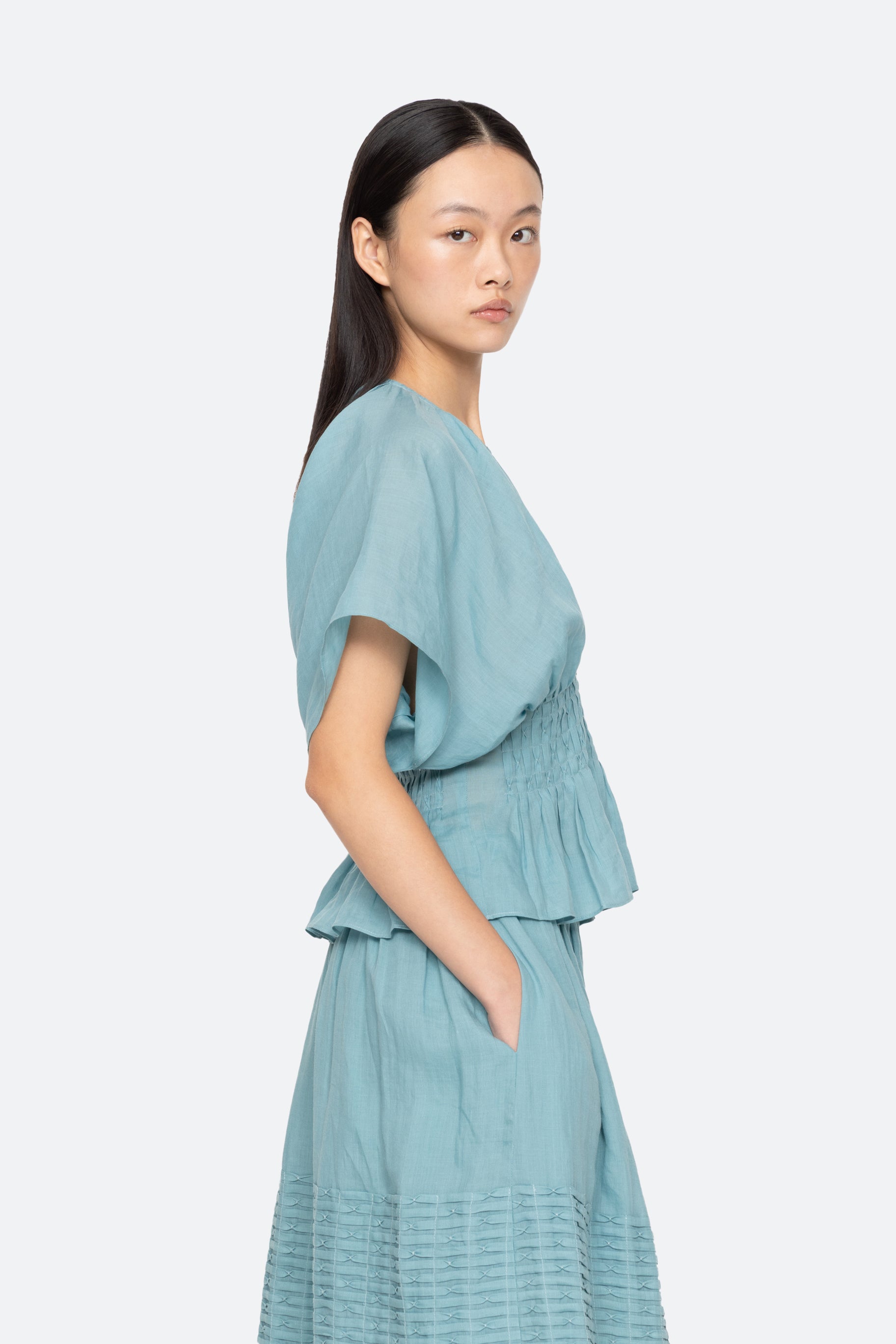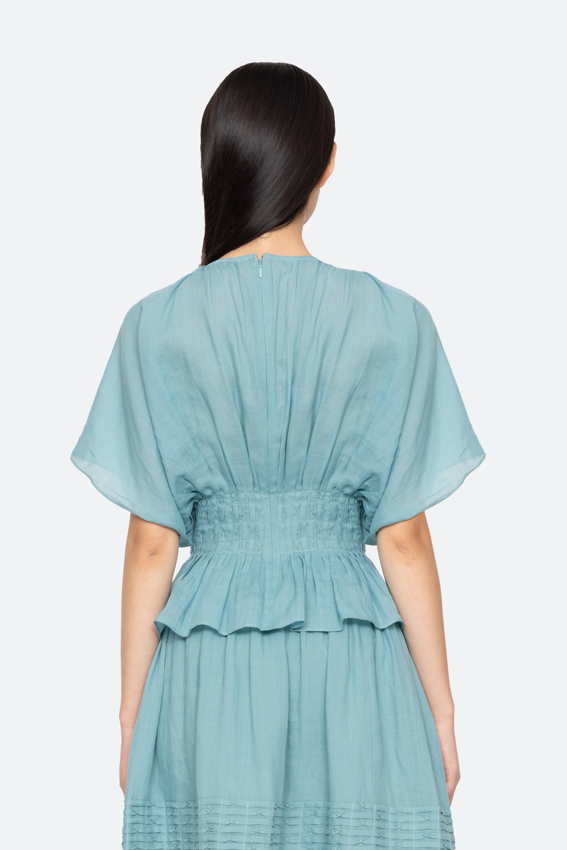 The Violet top features short sleeves and pintuck detailing at the waist, forming a subtle peplum hem that enhances its relaxed, flowing silhouette.