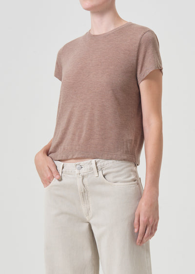 The perfect cropped t-shirt. The Adine is cut in a breathable, ultra-soft cotton, perfect for wearing alone or layering as Fall approaches. She wears best with low-rise jeans for the ultimate, easy flattering look.