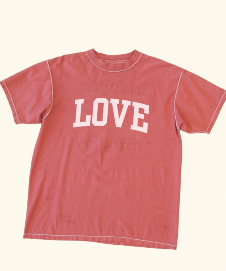 Each tee is unique, made from up-cycled t-shirts each in a brilliant shade of weathered red.